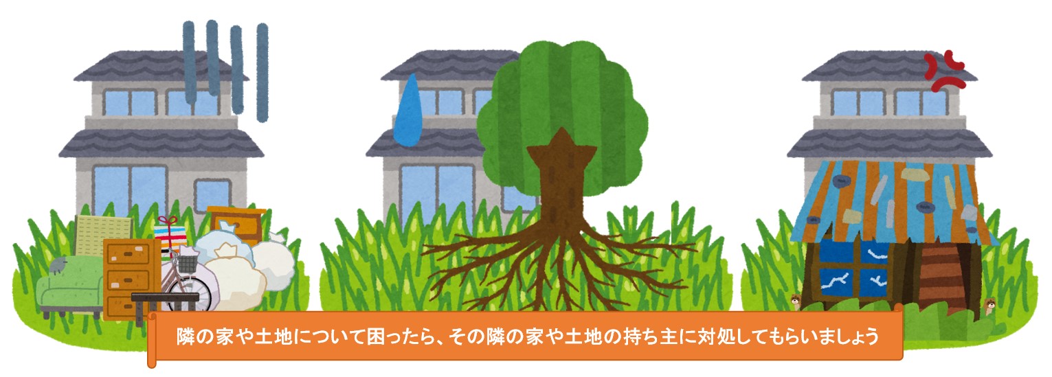 隣の家や土地について困ったことがあれば、まず、その隣の家や土地の持ち主にその旨を伝えて、対処してもらうことになります。困っているからと言って、自力でどうにかすると問題になる可能性があります。ただし、隣から伸びてきた根っこが自分の敷地に入ってきたときは、隣の持ち主に断りなく、根っこを切ることができます(民法233条4項)。
