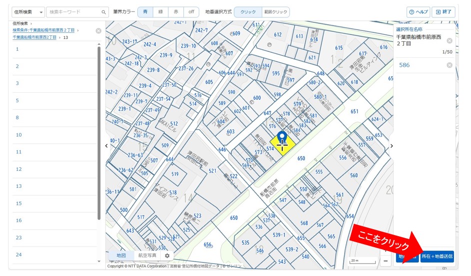 ⑤ 下部の「所在+地番送信」をクリックすると、「不動産請求」に選択した地番が入力される