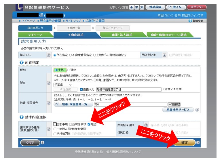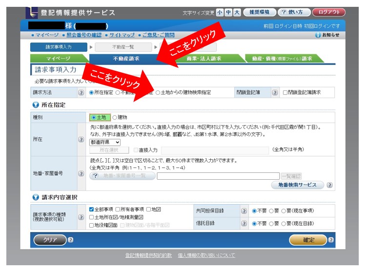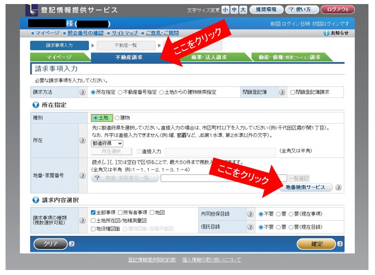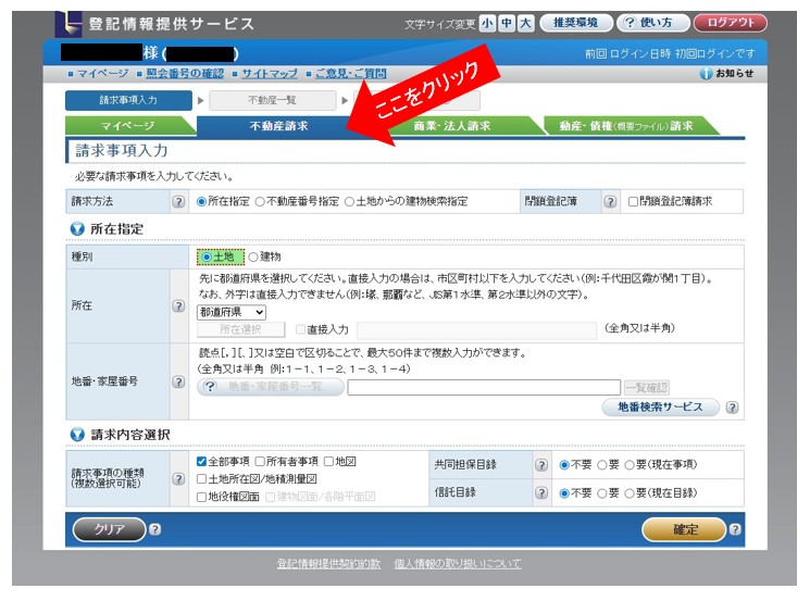 ① 不動産請求のタブの「所在」「地番・家屋番号」に自分の土地の所在、地番を入力する