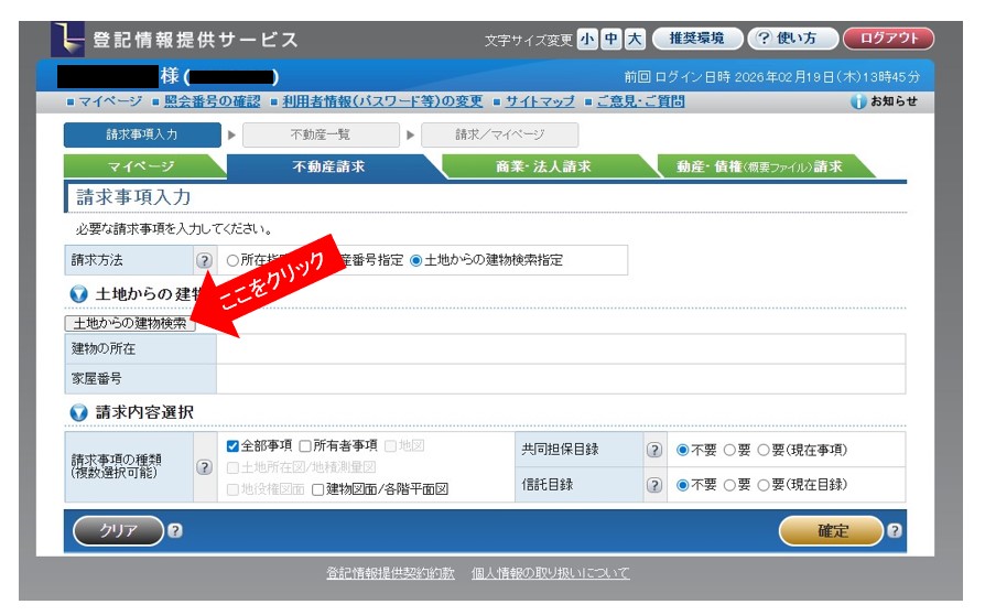 ⑥ 「請求する証明書を入力する」をクリックして、「物件情報を検索する」をクリックする