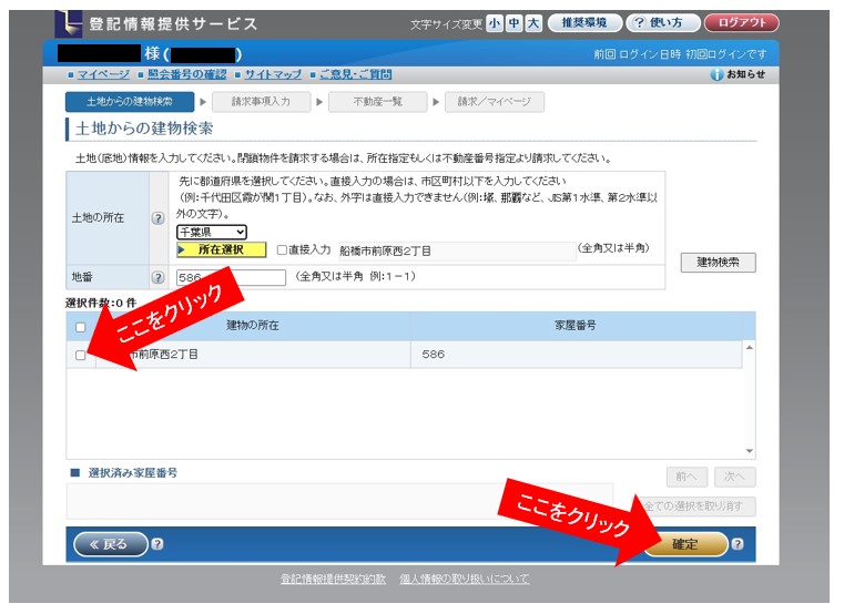 ③ 表示された建物の□に☑を入れて、「確定」をクリックする