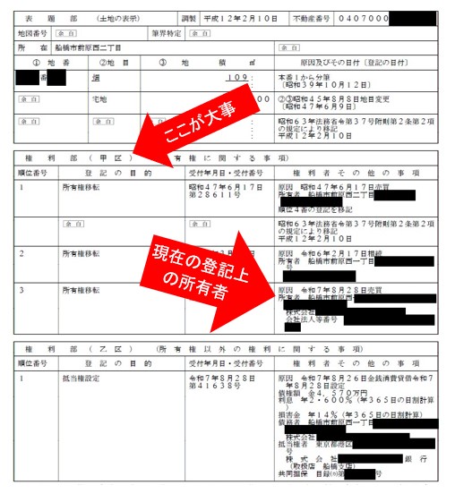 今回大事なのは、「権利部(甲区)」です。ここに持ち主(所有者)の情報が記載されています。