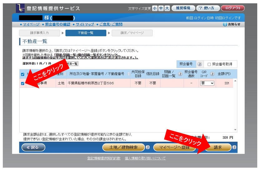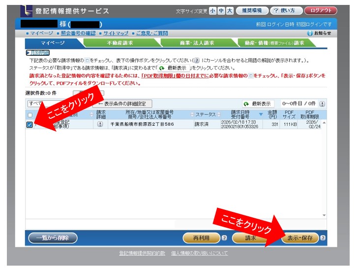 ⑤ 不動産一覧の□に☑を入れて、「請求」をクリックする