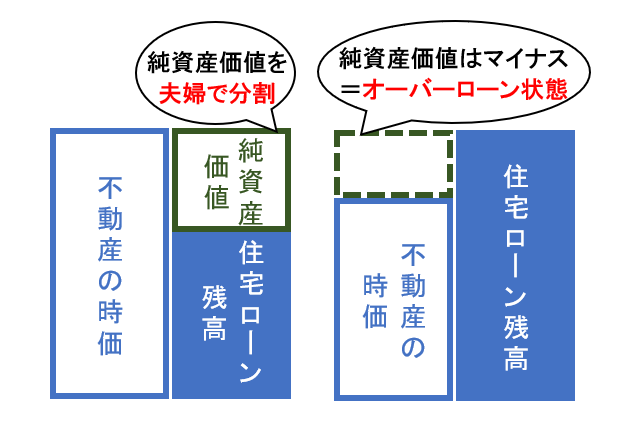 - 財産分与では不動産の純資産価値(時価-ローン残高)を基準に考える