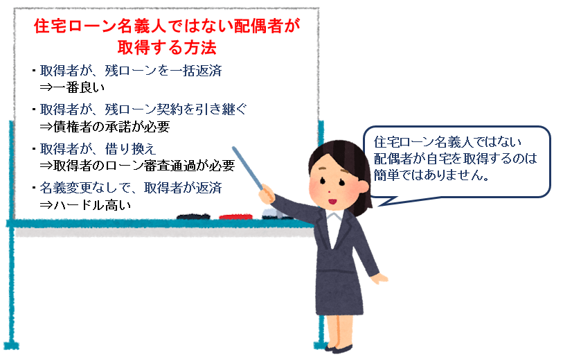 住宅ローン名義人ではない配偶者が自宅を取得するのは、簡単なことではありません。