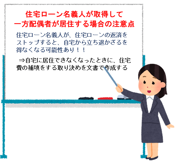 この方法の問題点は、住宅ローン名義人が返済をストップしてしまうと、債権者に抵当権を実行され、自宅から立ち退かざるを得なくなる可能性があることです。